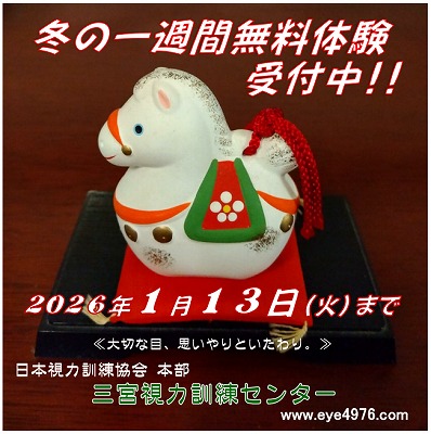 ●受付期間:2026年1月13日(火)まで ◆自宅コース 視力、年齢に適したトレーニング器機を 一週間お貸しいたします。 ※貸出し機器には、限りがあります。 ◆センターコース センターでのトレーニングチケット6回分 ※7日間有効 ●先ずは、適正検査を受けて下さい。 ※要予約 ☎0120-09-4976(ヨクナロー) ※電話受付:毎日午前9時~午後8時 是非、この機会に視力回復トレーニングを 体験していただき、視力回復効果を実感して ください。 ≪大切な目、思いやりといたわりを。≫ 【視力回復トレーニング・神戸で53年の実績】 ・類似センターにはご注意ください。 2ヶ所の国立病院による治療実験において、 93%の回復効果を実証‼ あなたにもあります!!『視力回復力』 視力回復トレーニングで、 良い視力を取り戻しましょう!