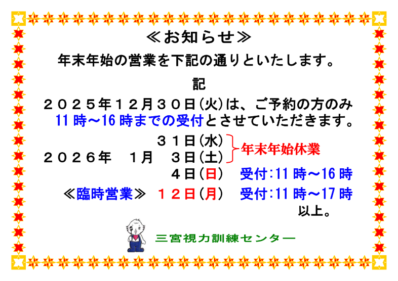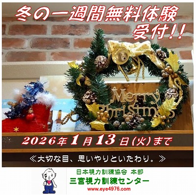 視力回復には興味があるけど・・・。 時間の都合がなかなかつかない・・・。 遠方でなかなか行けない・・・。 などでお越しいただけなかった方、 冬期休暇を利用して、 是非、この機会にご自宅でもセンターでも 体験していただき、 視力回復効果を実感してください。